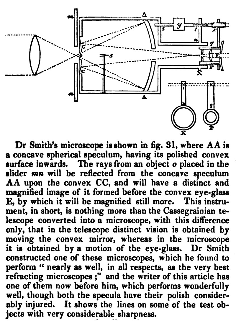 “Having made a few gross experiments with a concave metal that I had by me, whose focal distance was 2/3 inch, and with several convex eye-glasses applied to it, I found that the colours of objects in a reflecting microscope appeared much more beautiful and natural than in double refracting microscopes of the best sort; their proper colours being free from the mixture of other colours arising in refracting microscopes from the different refrangibility of rays”.
