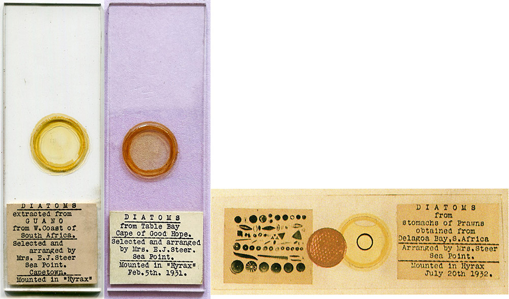 For example, a 1931 letter by Nicholas Brown on “An interesting diatom” began, “Last year I received from Mr. E.J. Steer, of Sea Point, South Africa, a slide of Glyphodiscus, nicely mounted by Mrs. Steer, which he had found living and growing on seaweed on rocks at Gordons Bay”.