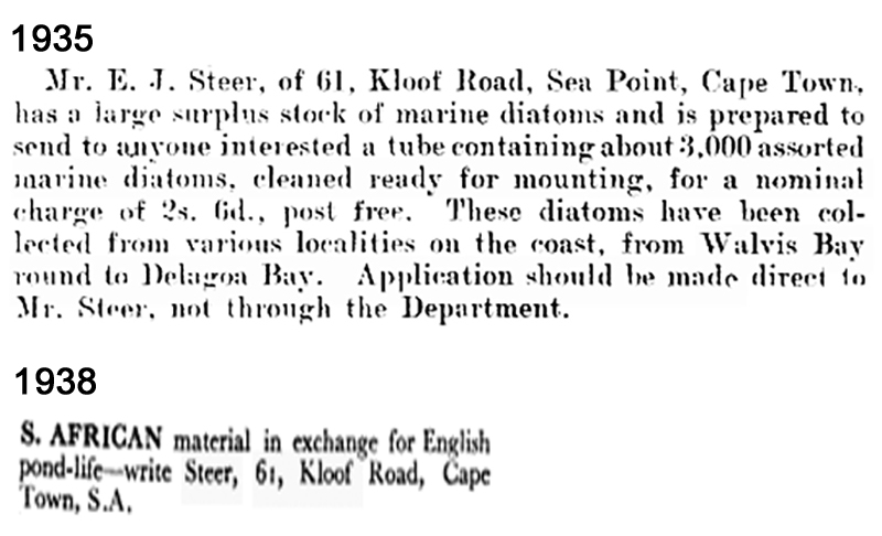 “Mr. E.J. Steer, of 61, Kloof Road, Sea Point, Cape Town” offered to sell tubes “containing about 3,000 assorted marine diatoms, cleaned ready for mounting” in 1935 (Figure 3). The Steers published offers in the English magazine The Microscope in 1938, seeking to exchange South African “material” for English “pond-life”. “Steer, E.J.” was listed in editions of The Naturalists’ Directory, noting that they were interested in exchanging diatoms.