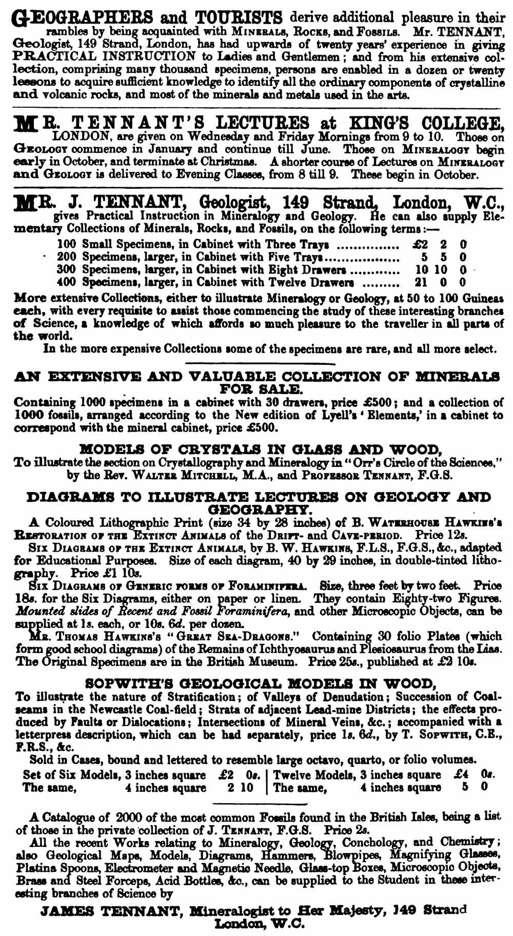Journal of the Geological Society of London (1865) Advertisement from Tennant, Vol. 39, page 2