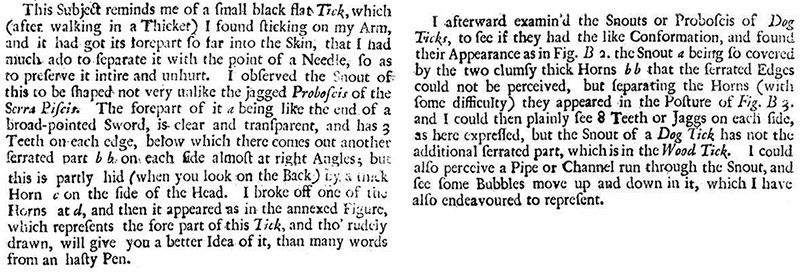 Possibly the earliest description of ticks, as seen through a microscope. An anonymous microscopist wrote of these, and many other discoveries, that were found through use of the newly-invented Wilson Screwbarrel Microscope, in "Philosophical Proceedings" during 1702-1703, Vol. 23, pages 1357-1372, http://rstl.royalsocietypublishing.org/content/23/277-288.toc.