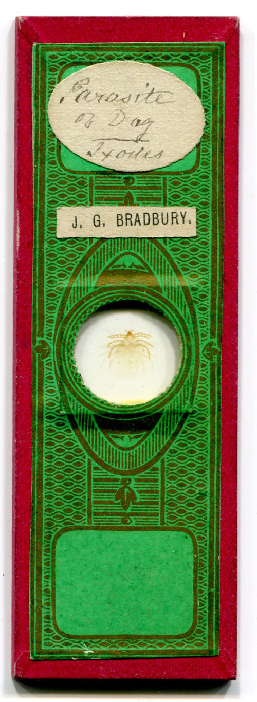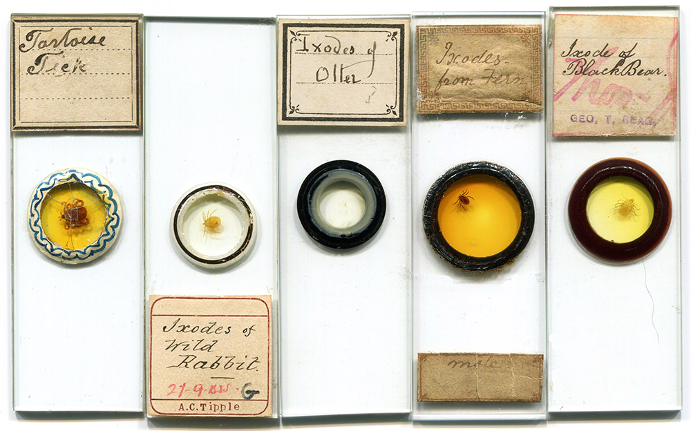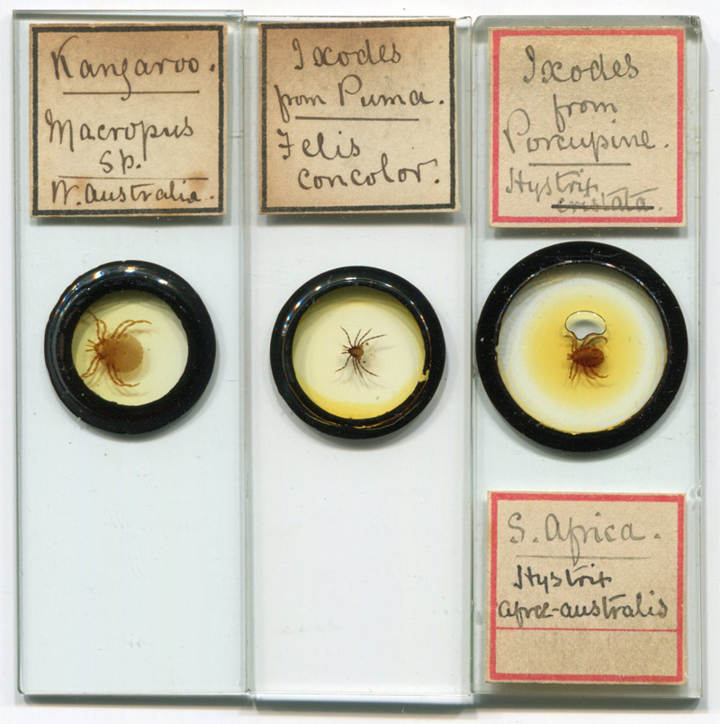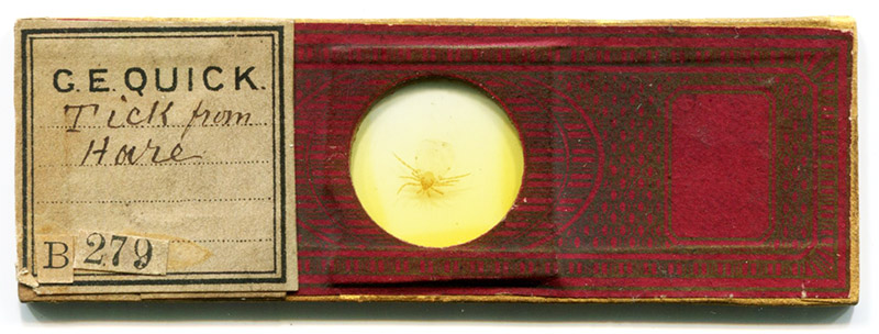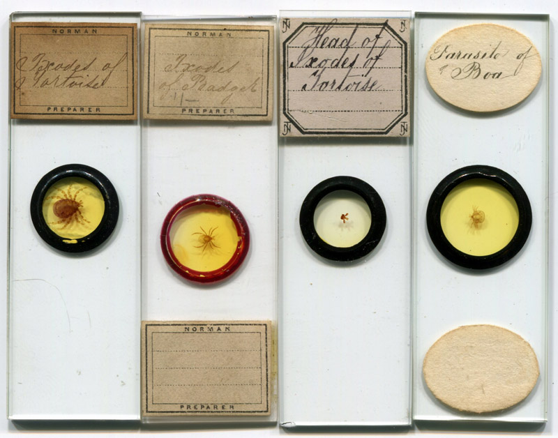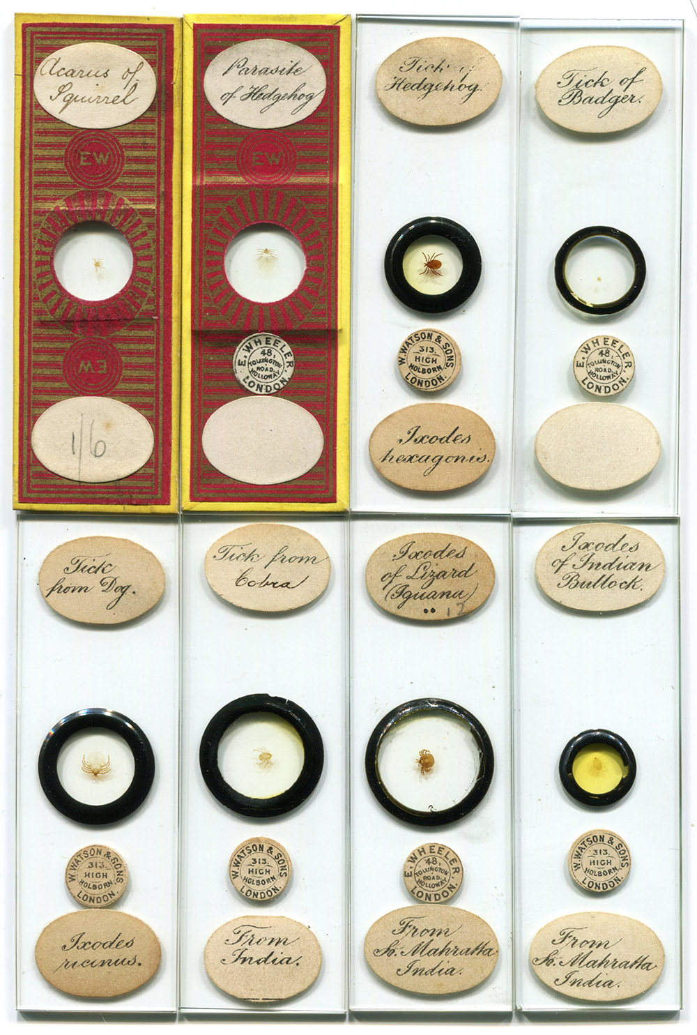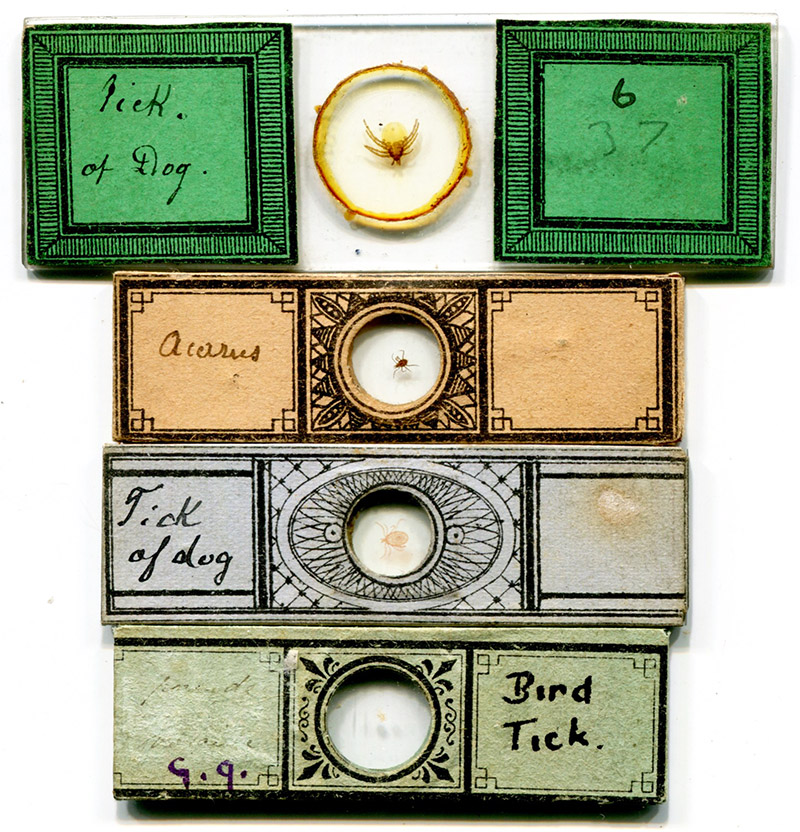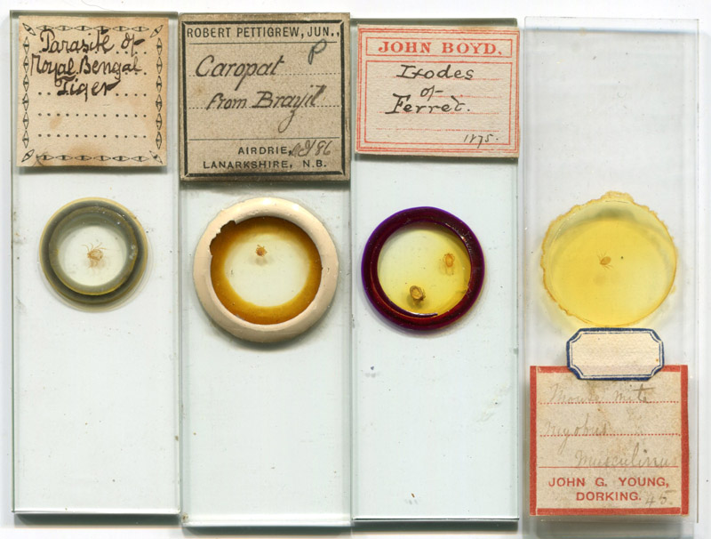 Slides by, left to right, an unknown microscopist, Robert Pettigrew (1868-1953), John Boyd (1852-1929), and John Young (who misidentified a tick for the mouse mite Myobus musculinus).