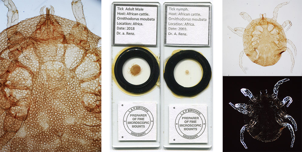 Most people are familiar with "hard" (ixodid) ticks, and the vast majority of slides are of such ticks. The "soft" (argasid) ticks comprise another major family of ticks, but are relatively fast feeders and are rarely seen by people. These are rather uncommon slides of an African argasid tick, Ornithodorus moubata, which may transmit relapsing fever. An adult male and a nymph are shown. The nymph was photographed with either normal brightfield (top, right) or between crossed polarizing filters (bottom, right)