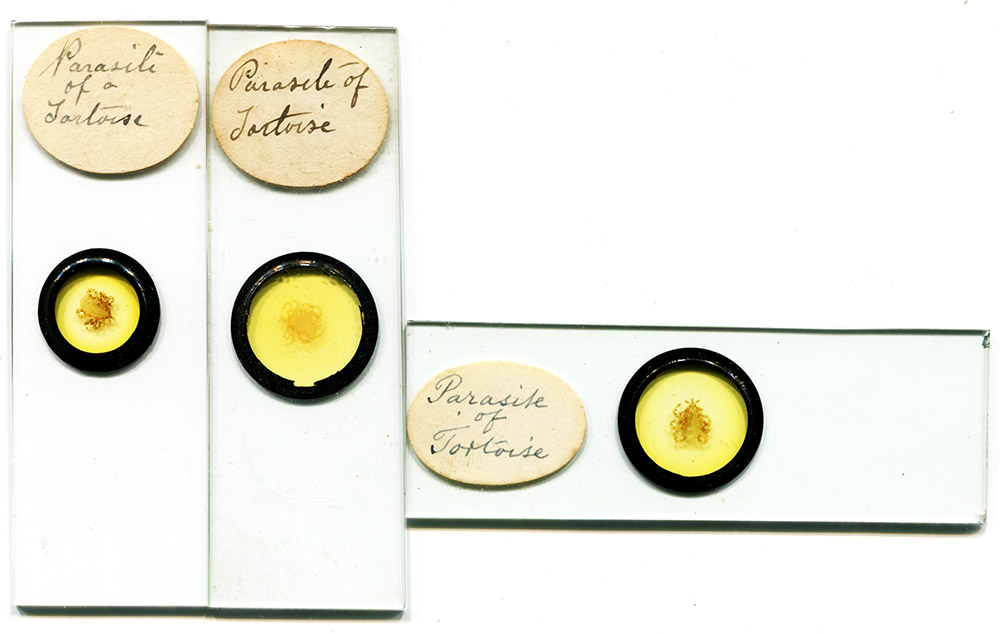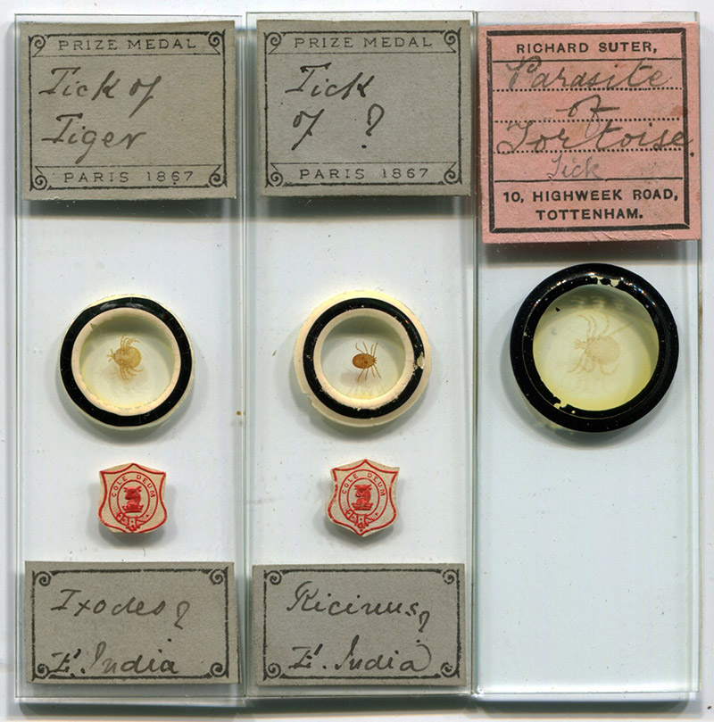 Three slides of ticks from a tortoise, of English origin. All three appear to have the same handwriting. The maker is not known, but may have been a professional, since many slides are known that have this handwriting.