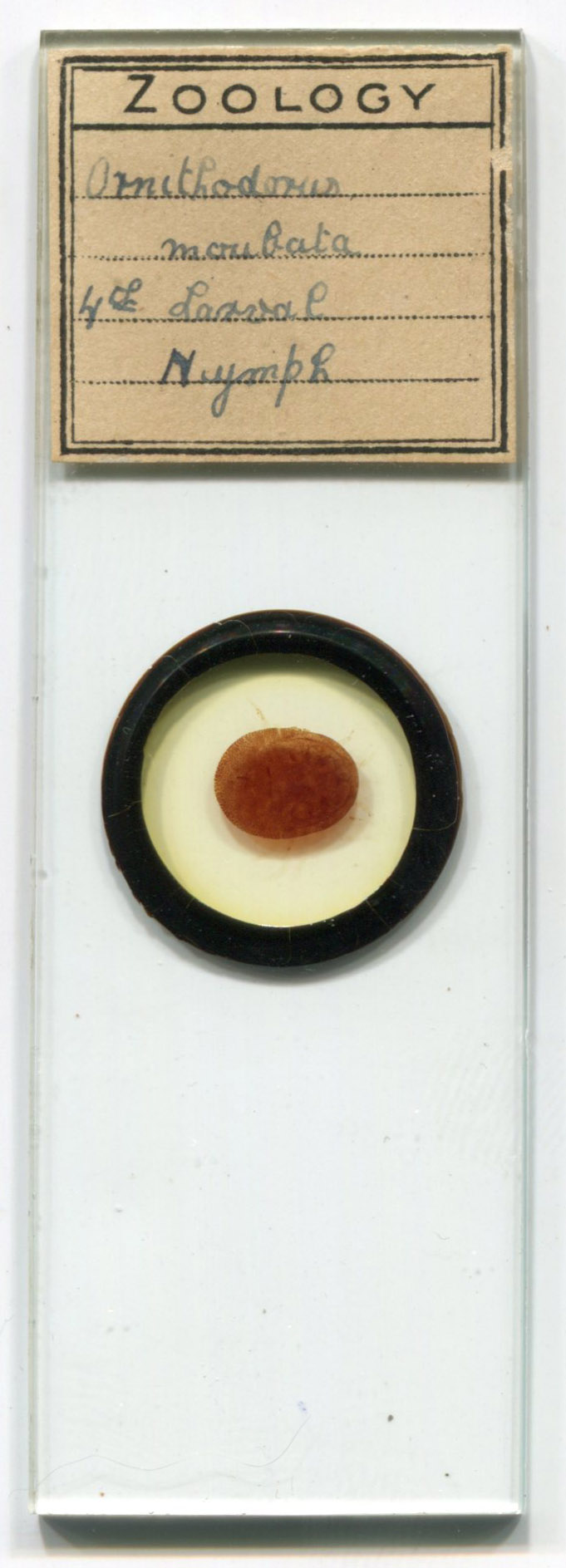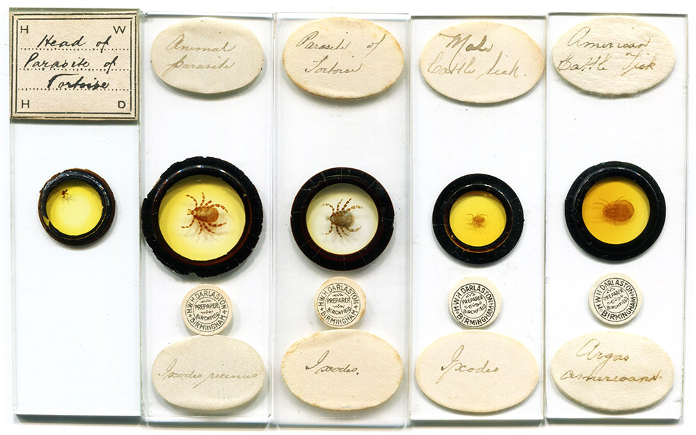 Slides by professional Herbert William Hutton Darlaston (1867-1949). The slide on the left has a rare label with Darlaston’s initials, "H.W.H.D.", an example of his early work. The slide on the right holds a "soft" tick, Argas miniatus. A nineteenth century report found these on cattle in the U.S.A., and called it by the now-invalidated name of Argas americana, as used here by Darlaston. Argas miniatus primarily infests chickens and other birds.