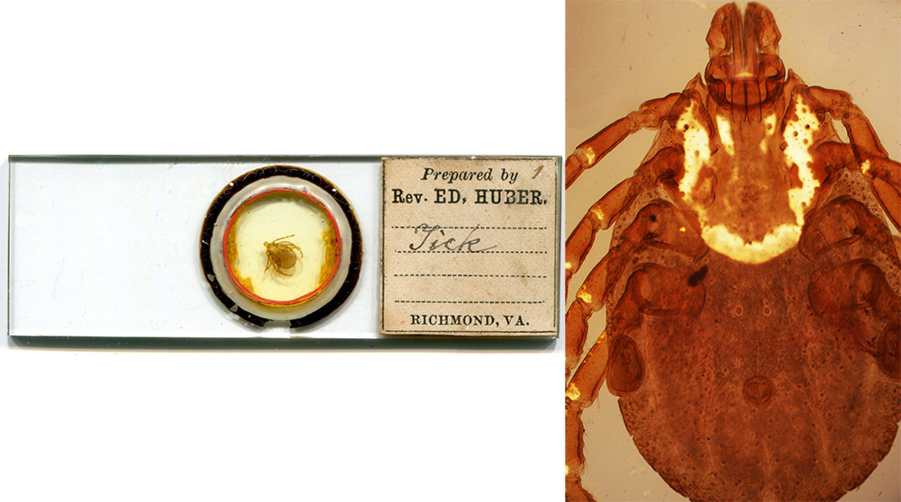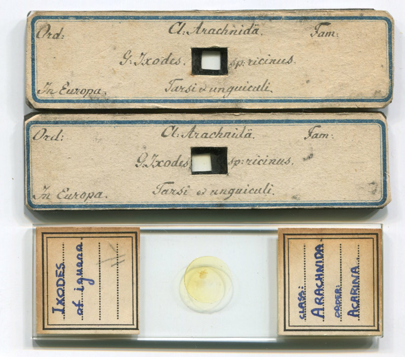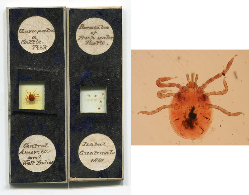 Two slides of ticks from Central America, one of which is dated 1860. The left slide bears an adult, described as "Garapata or Cattle Tick", the left holds several larvae, apparently removed from a freshwater turtle in Izabal, Guatemala. It is not uncommon for turtles to be infested. Recent studies demonstrated that ticks can survive for many days when submersed in water.