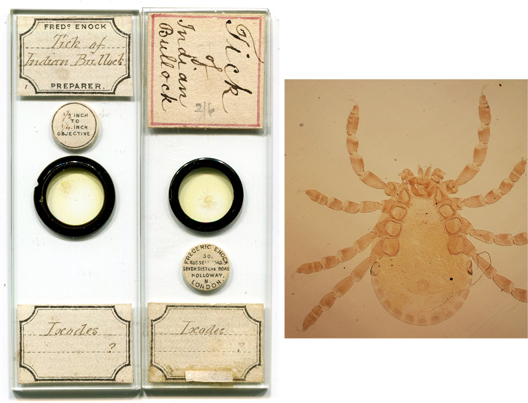 Two professionally prepared slides from the twentieth century, by Flatters and Garnett, and by A. Lister. The Lister slide holds a copulating pair of ticks.