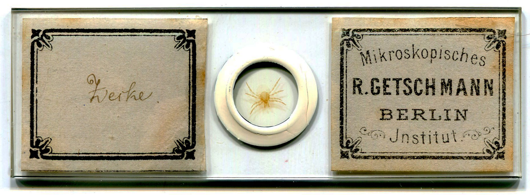 Tick mount from Dr. Eduard Kaiser’s Institut für Mikroskopie, Berlin. Circa 1890. The specimen appears to be the nymph stage of Ixodes ricinus, which is fairly common around Berlin.