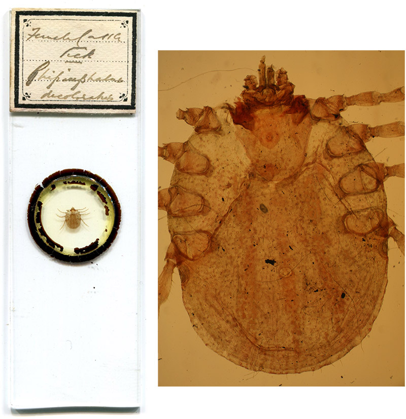 Circa 1880 preparation of a female adult Ixodes ricinus by Rudolf Getschmann, Berlin.