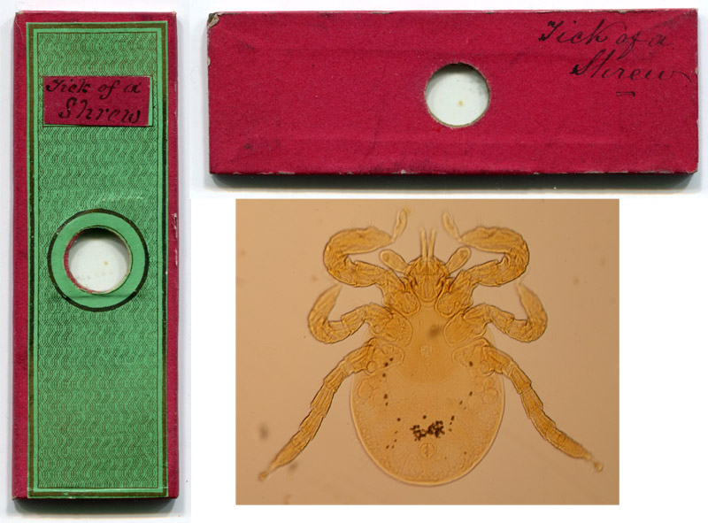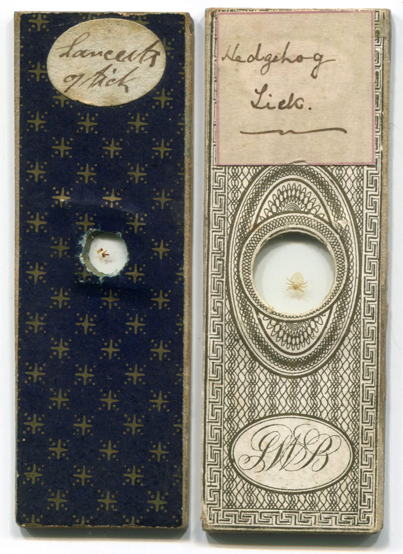 "Parasite of Pheasant" and "Acarus Ricinus", prepared ca. 1850 by professional slide-maker Cornelius Poulton (1814-1854). Poulton cut off the posterior of the larger, right-hand specimen, to facilitate clearance of the internal organs.