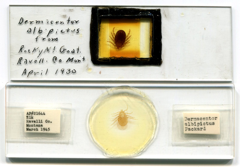 Late twentieth century slides of Ixodes scapularis ("dammini"), Dermacentor andersoni and Rhipicephalus sanguineus, by Ward’s and Carolina Biological.