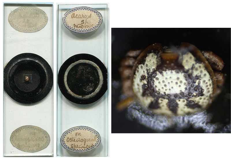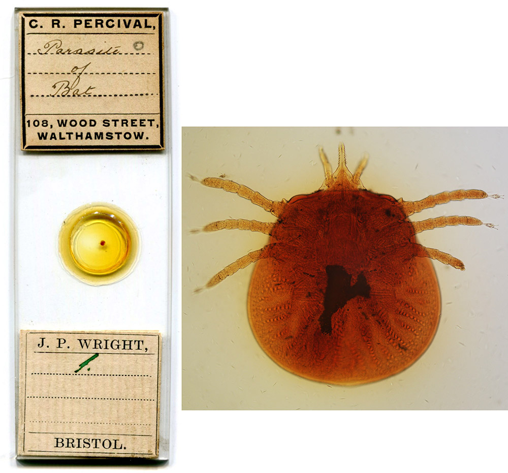 A larva of Carios vespertilionis, prepared ca. 1905 by Charles R. Percival (1879-1960). The lower label indicates that it was once owned by Joseph P. Wright (1855-1942), who is known to have purchased slides from Percival at that time.