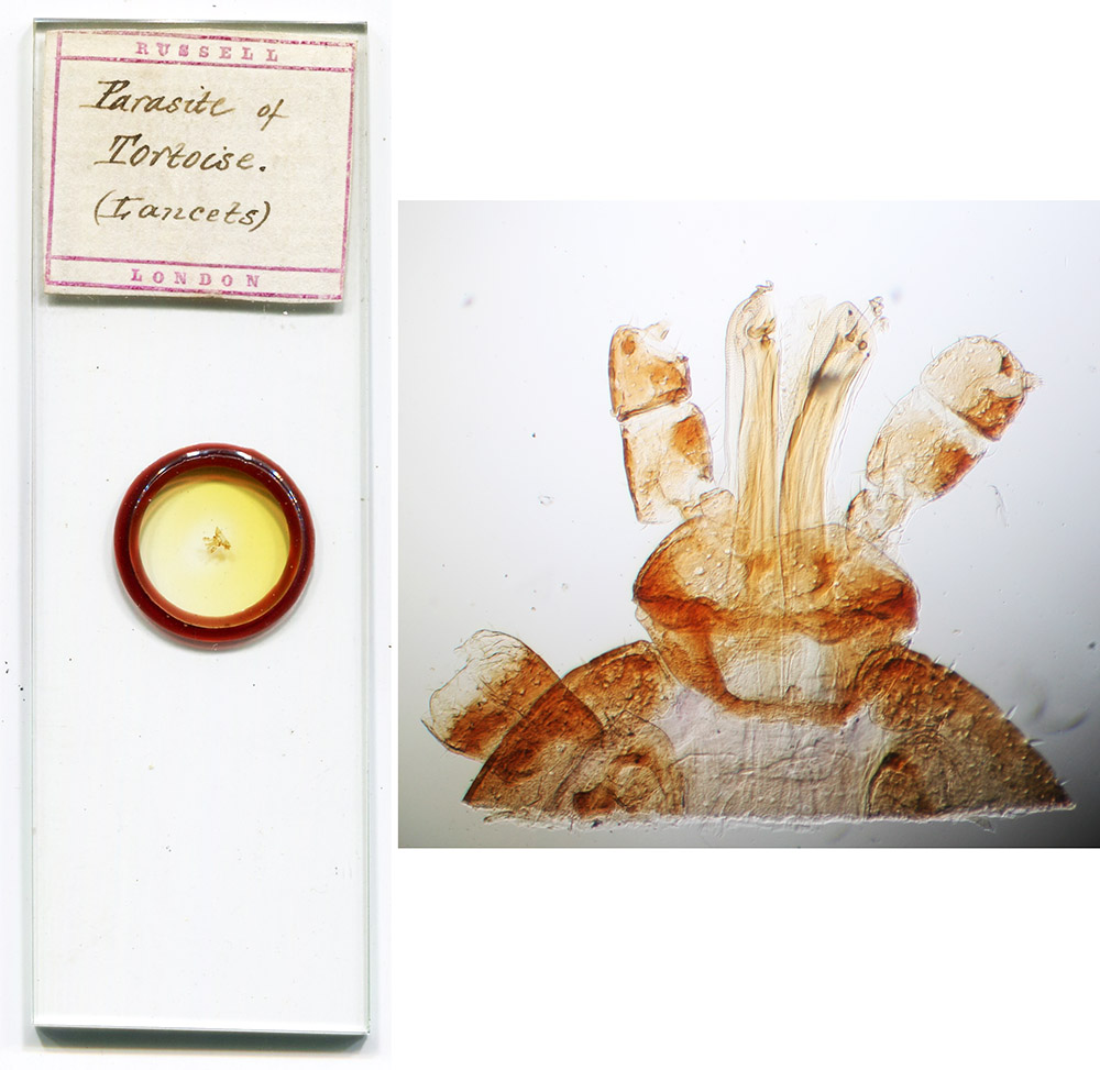 "Tick of tortoise", prepared ca. 1870 by professional slide-maker Charles M. Topping (1799-1874).