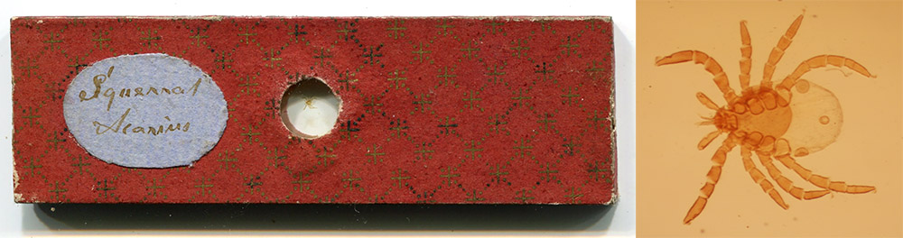 An amateur slide of a larval tick (note 3 pairs of legs), by R. Harrison, of Hull, England. Circa 1870.