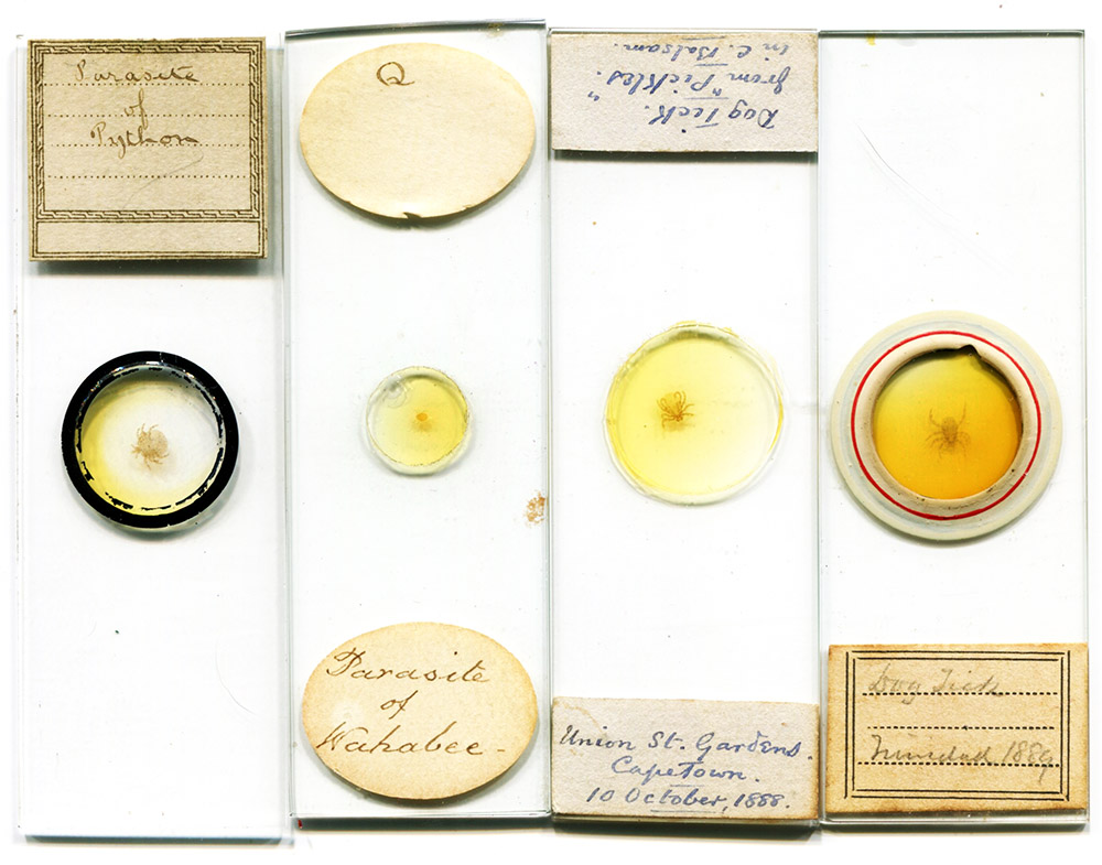 Four amateur slides of ticks, from a python, a "wahabee", and dogs from Capetown, South Africa (1888) and Trinidad (1889). By unknown mounters.