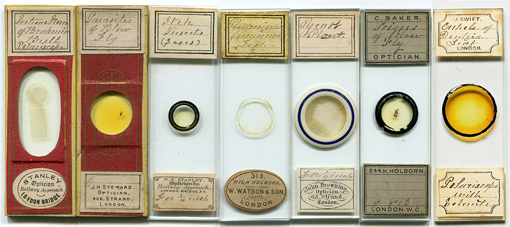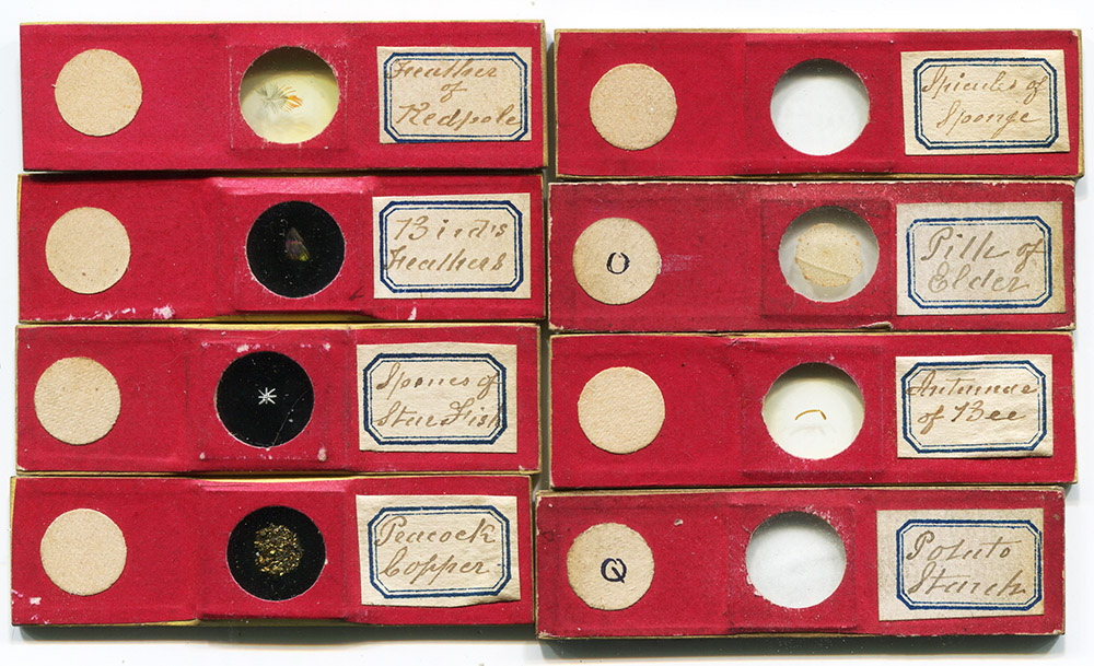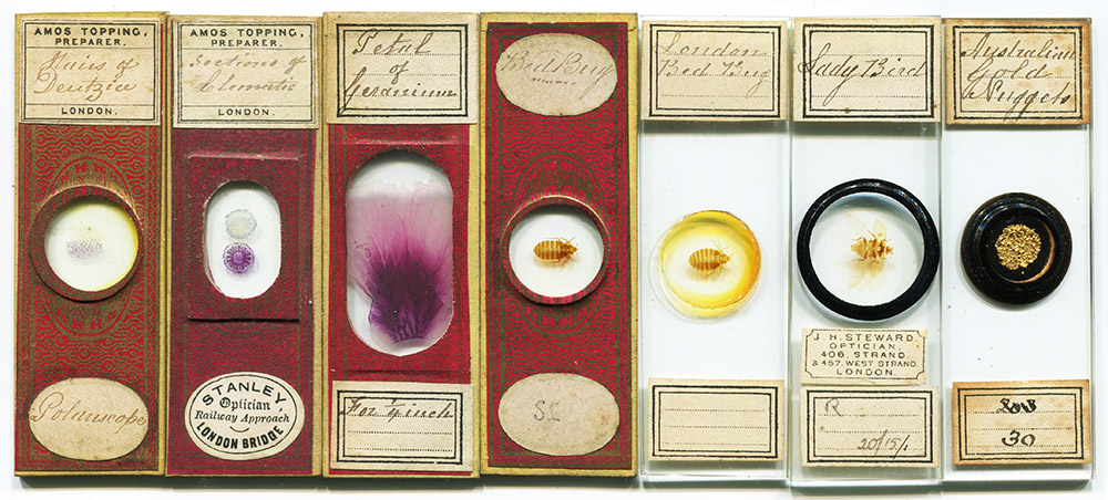 Figure 1. A sampling of microscope slides that were prepared by Amos Topping. Paper-wrapped microscope slides fell out of fashion ca. 1880, so those are presumably his earlier productions.