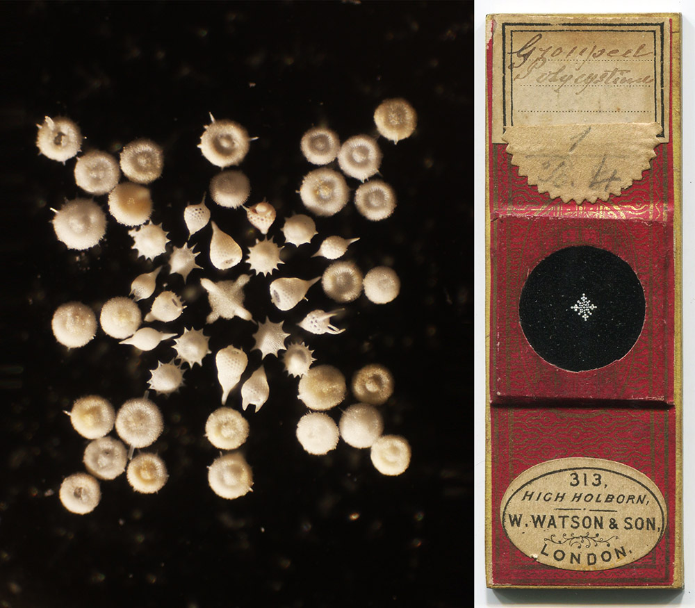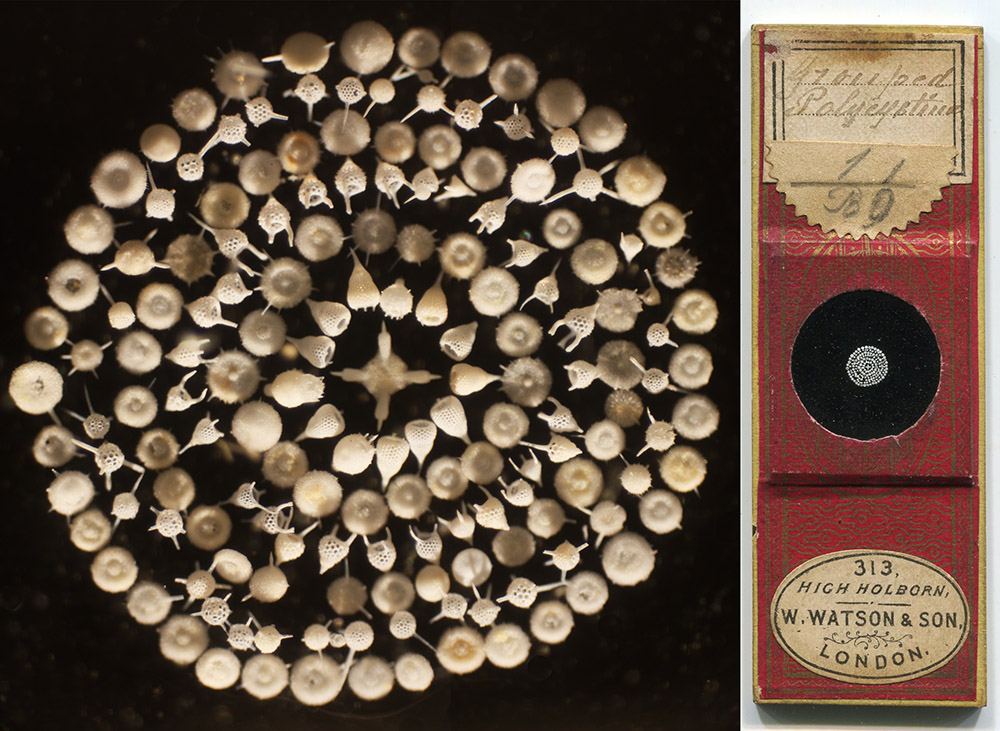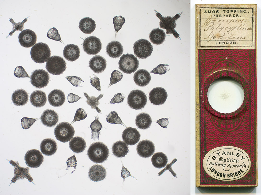 “Grouped Polycystina”, by Amos Topping. Note retail by Watson & Son, London. William Watson’s business changed to that name ca. 1867, then became Watson & Sons in 1883. Imaged with a 3.5x objective lens, indirect light, and C-mounted digital SLR camera on a Leitz Ortholux II, two images stitched together with Photoshop.