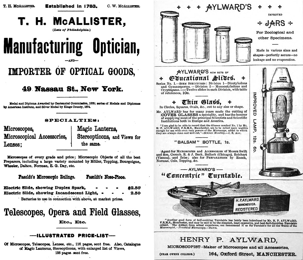 Advertisements that include microscope slides by Amos Topping, from McAllister (1887, Philadelphia, USA), and Aylward (1888, Manchester, England).