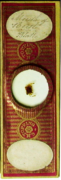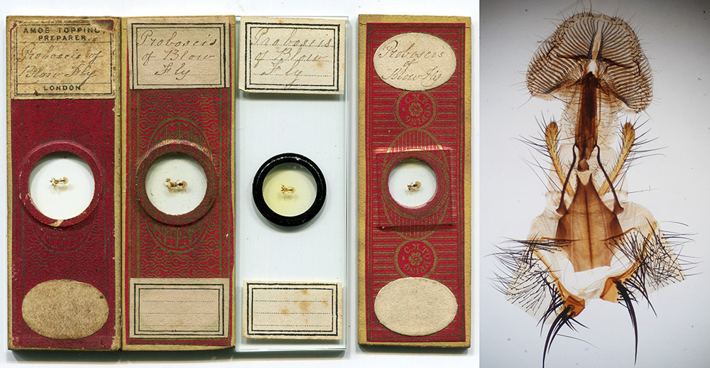 Amos and Charles Topping were both renowned for their mounts of “proboscis of blow fly”. The blowfly’s mouthparts present an intriguing complexity of forms, which the Toppings mounted very flat, such that all components were clearly visible in a plane of view. Frederick W. Watson-Baker wrote about Amos, “he has always been noted for one particular slide, and that is the proboscis of the blow-fly. No other preparer has succeeded in so mounting this subject as to render it sufficiently flat for use as a test-object; and unless some other worker knows the secret, it is likely to become one of the lost arts, and, as we at present know it, a rarity. Mr. Topping was always a little reticent regarding his method of preparing this object, and if he were asked whether he would mind saying how it was done, he promptly replied 'With pleasure, sir', and proceeded as follows: 'I put a piece of sugar upon my bench and hold a blow-fly very closely to it; directly he puts out his proboscis to touch the sugar. I just snip off the tongue with a pair of scissors I keep handy for the purpose, and straightway mount it’."