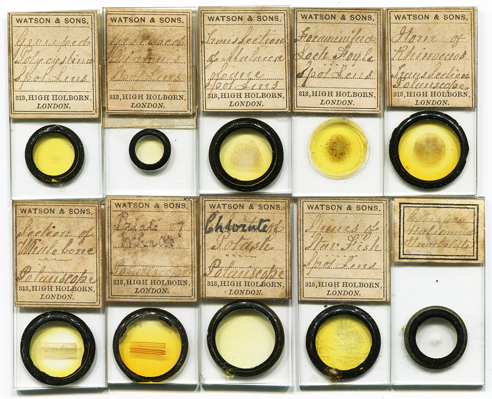 A set of 1x2 inch slides with Amos Topping’s handwriting, produced for W. Watson & Sons. The set presumably accompanied a microscope or projector that could not hold the standard 1x3 inch format.