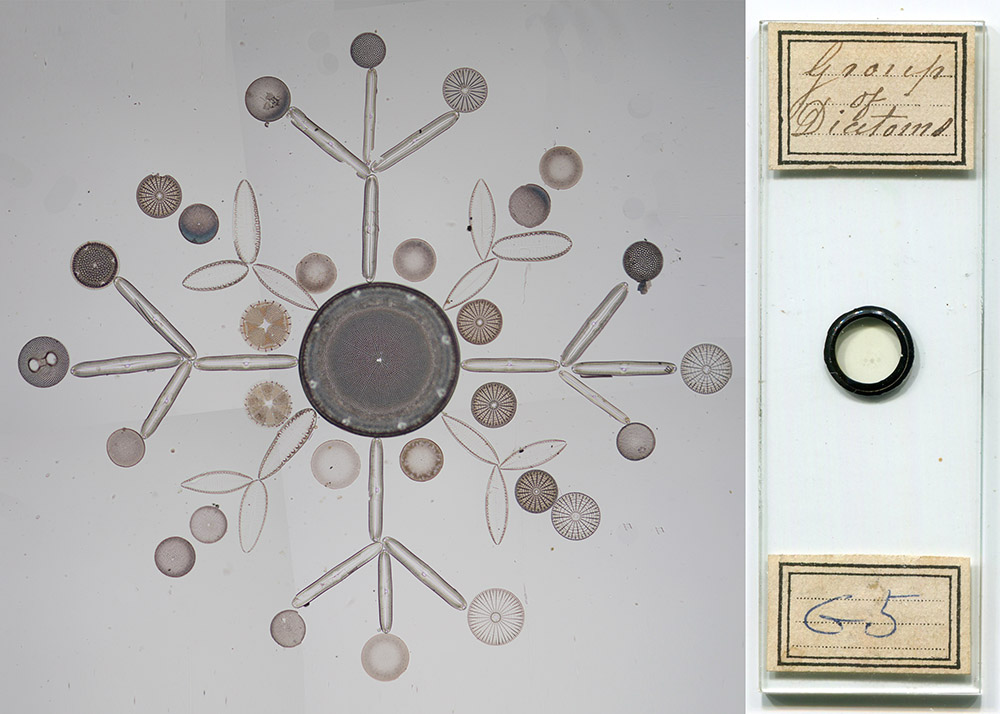 “Group of diatoms”, by Amos Topping. Absence of wrapping papers suggests production after that style fell out of favor, ca. 1880-1900. Imaged with a 10x objective lens, transmitted light, and C-mounted digital SLR camera on a Leitz Ortholux II, four images stitched together with Photoshop.