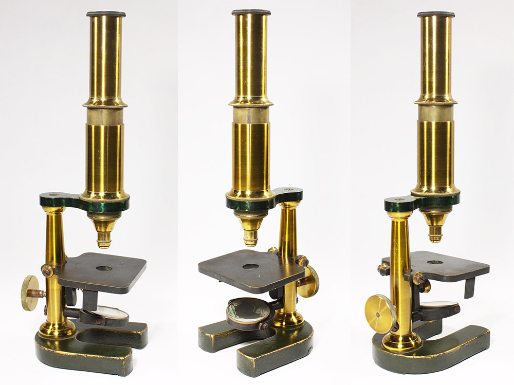 Two examples of Waechter’s Stand Vb. The microscope on the right has a joint that allows inclination, while the example on the left and center has a solid limb. The left and center microscope has serial number 14586, and that on the right has serial number 16864. Both are engraved “Friedenau”, dating them to after 1890. Images adapted for nonprofit, educational purposes from internet auction sites.
