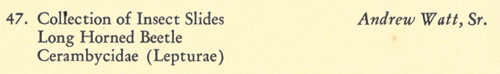 Andrew Watt, of Brooklyn, New York, was an expert amateur slide-maker who prepared high quality mounts of insects and spiders (Figure 1). He is known to have been an active member of the New York Microscopical Society during the mid-late 1930s.