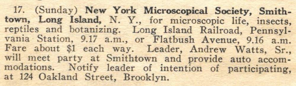 To judge from the quality of Watt's slides that he produced in 1937, he must have taken up that hobby quite some time earlier. Two records are known of his participation in events of the New York Microscopical Society: he exhibited a "collection of insect slides" at the 1938 Annual Exhibition of the N.Y.M.S (Figure 2), and, on JUly 17 of the same year, led an outing to Smithtown, Long Island to see "microscopic life, insects, reptiles, and botanizing" (Figure 3).