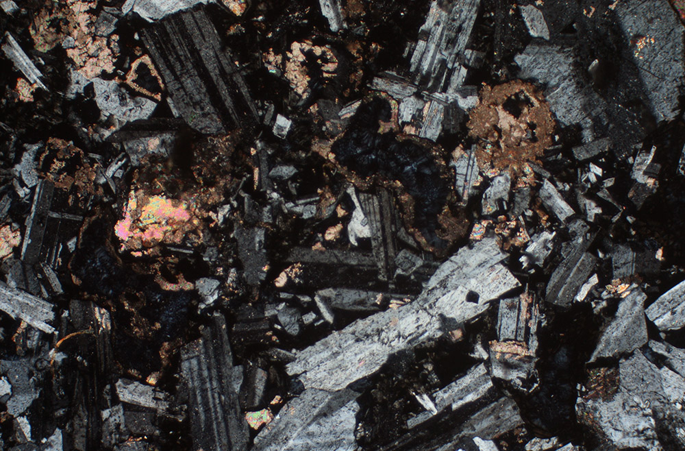 Diabase from a quarry in the Breidden Hills, by W.W. Watts (see Figure 1, right slide, number 312). Photographed with a 3.5x objective lens, a C-mounted digital SLR camera, and crossed polarizing filters.