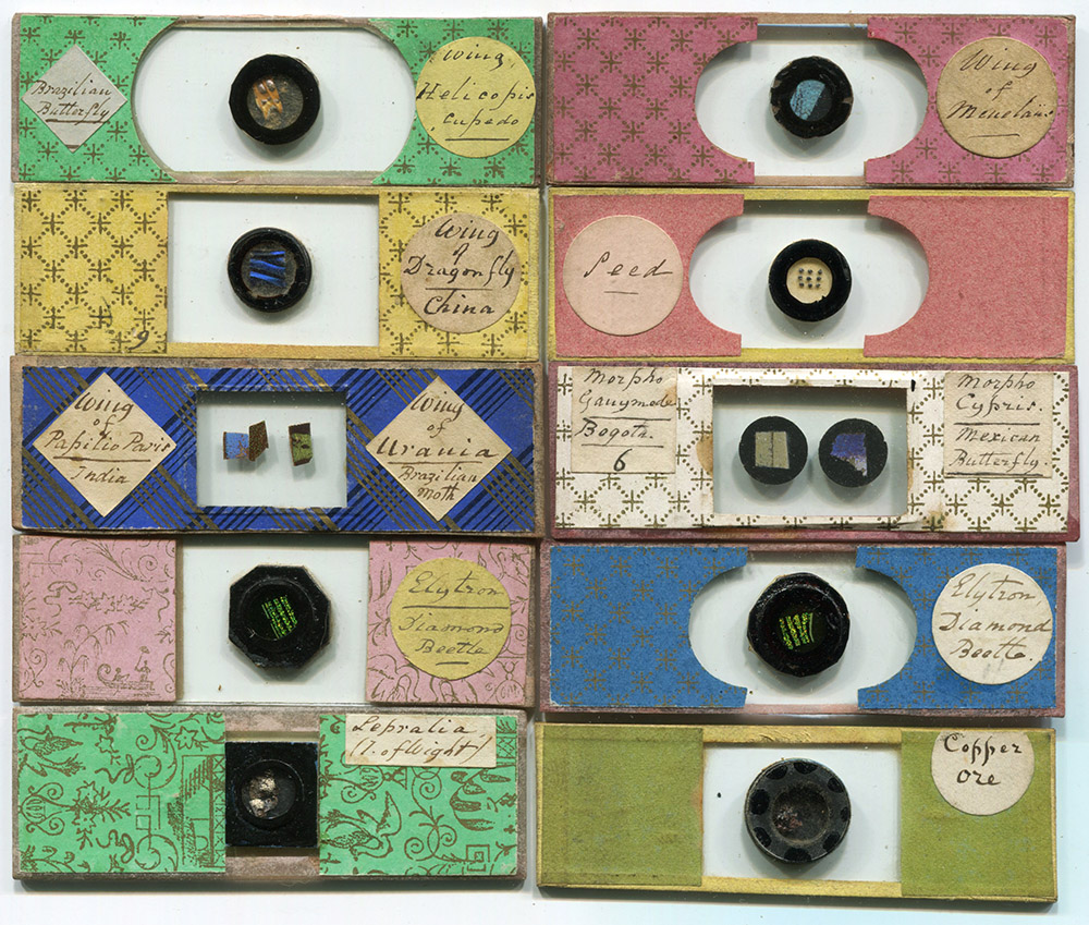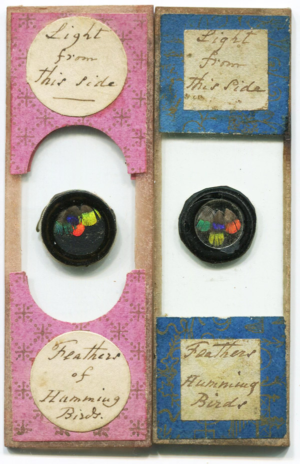 Attractive specimens in attractive slides: feathers of hummingbirds. Multiple copies of this and other subjects are known, suggesting that the maker was a professional slide-maker.