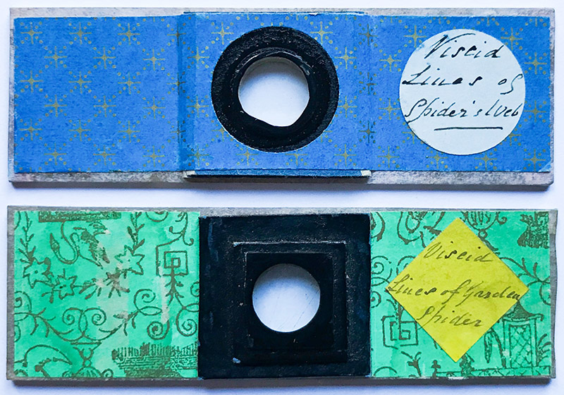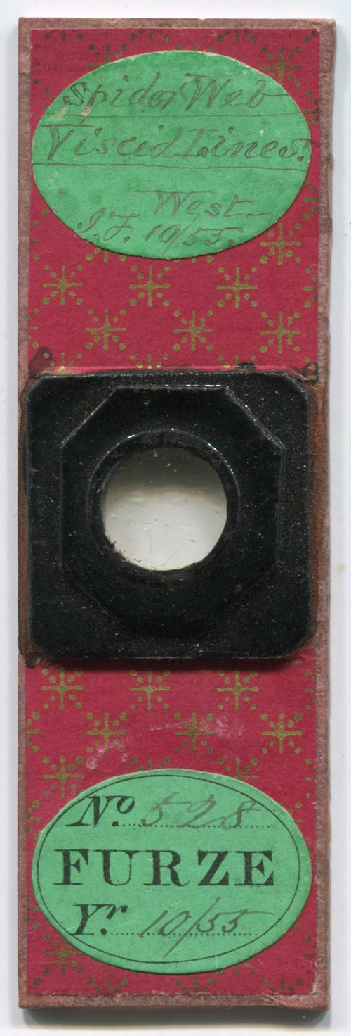 John Furze (1817-1859), an early member of the Microscopical Society of London, had a habit of re-labeling slides that he obtained with information such as the maker and the date of acquisition. He noted that a Half-Papers slide of “Spider web viscid lines” was made by “West”, and acquired in 1855 (Figure 3).