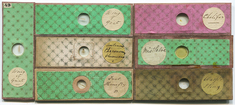 This prolific English mounter produced unique, paper-covered microscope slides: the raw glass edges were covered with narrow strips of colored paper, while the front and back often received only partial coverings with paper (Figure 1). This unusual practice led to the slide-maker being nicknamed “Half-Papers” by modern collectors. A wide variety of patterned and plain papers of many colors were used, making for very attractive-looking slides. Half-Papers also produced slides that are entirely covered with papers, yet are recognizable by the maker’s handwritten specimen descriptions. Numerous copies of many different subjects are known, leading to the assumption that Half-Papers was a professional slide-maker. Dated slides imply activity between ca. 1850 and the mid-1870s.