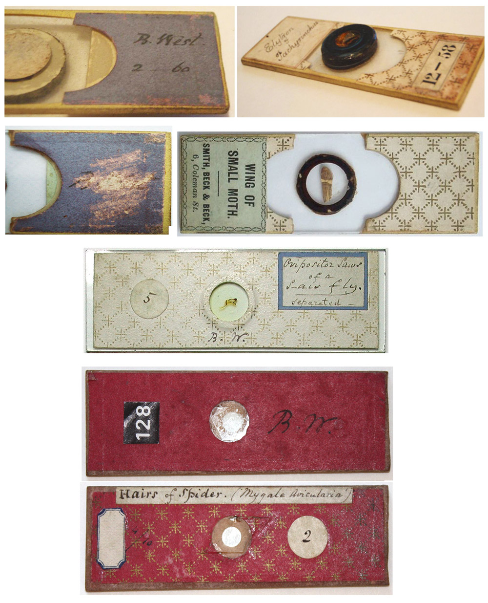 West prepared a number of slides with “Spider web viscid lines” (e.g. Figures 3 and 11). These are spider web strands with evenly-spaced globules of sticky substance. The means by which the spacing was achieved was a subject of curiosity. Richard Beck presented a description of his studies on viscid lines in 1862, in which he solved the mystery. This was six years after West produced the viscid line slide that is shown in Figure 3, so the topic may not be a direct link between West and R. Beck.