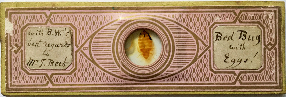 A slide of “bed bug with eggs”, “with B.W.’s best regards to Mr. J. Beck”. Image courtesy of Trevor Gillingwater.