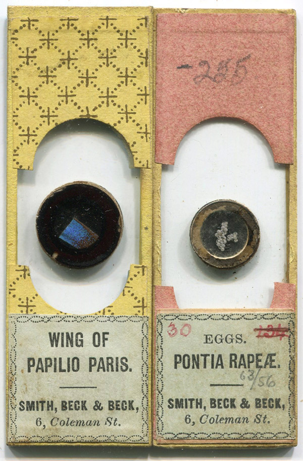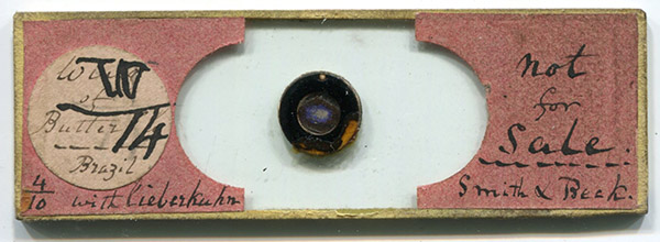A slide by B. West of “Wing of butterfly, Brazil” carries additional handwriting that appears to be West’s: “Not for Sale - Smith & Beck” (Figure 7). Presumably, this was a sample slide displayed at that microscope shop.